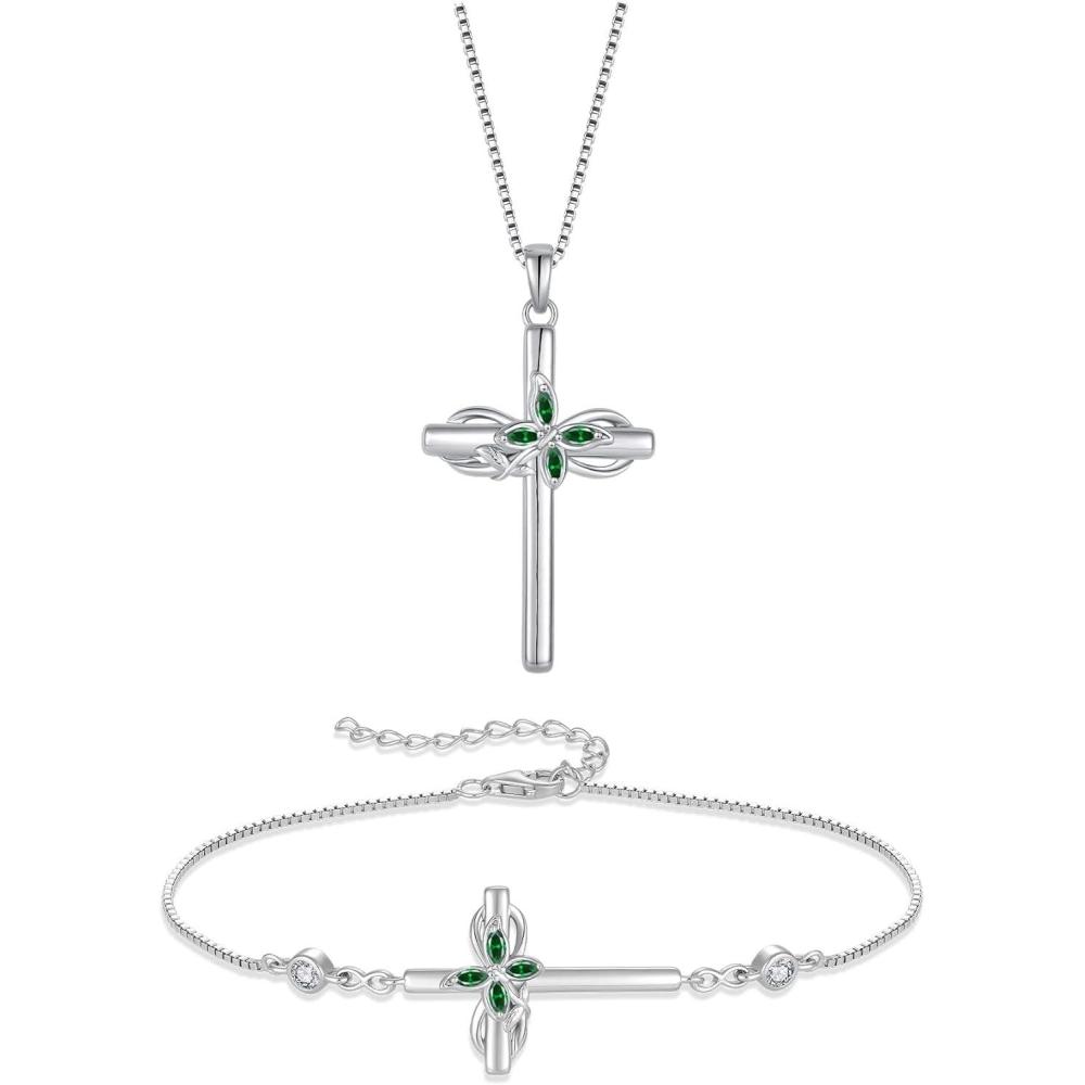 imageCross Necklace and Bracelet for Women 925 Sterling Silver Infinity Butterfly Pendant Necklace Bracelet Emerald May Birthstone Jewelry Set Crucifix Religious Gifts for Her