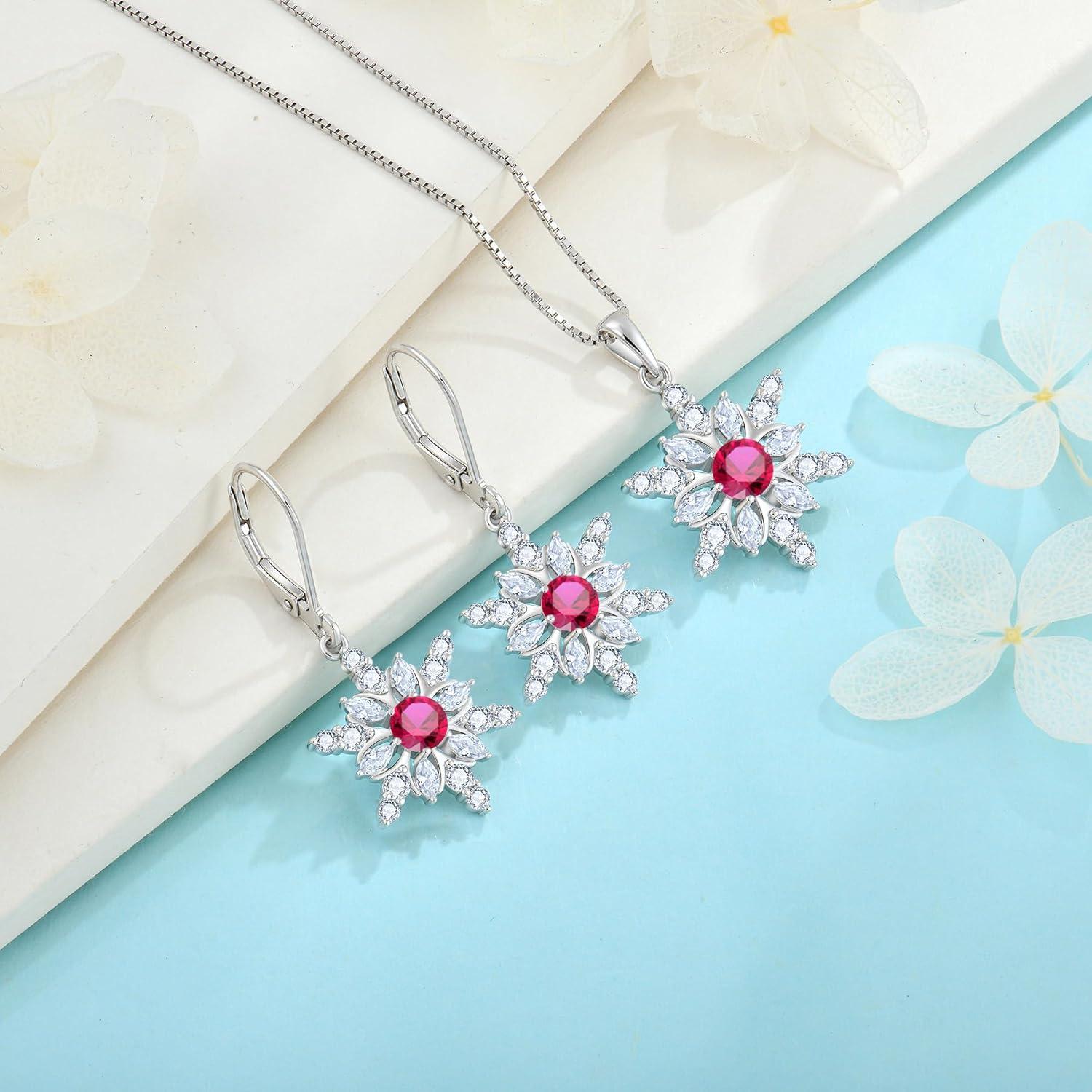 Snowflake Jewelry Set for Women 925 Sterling Silver Ruby Christmas Necklace Earrings July Birthstone Jewelry Gifts for Her