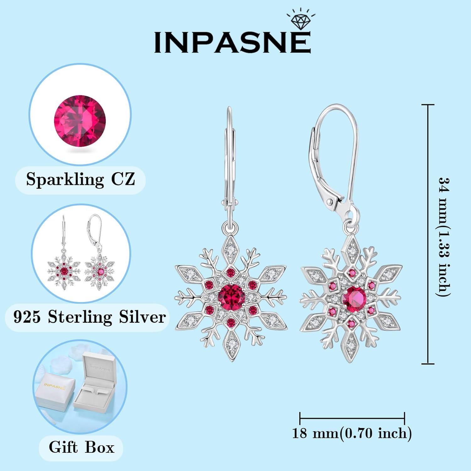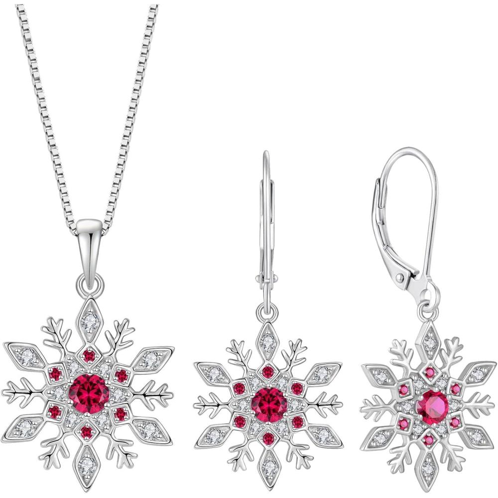 Inpasne Snowflake Necklace Earrings 925 Sterling Silver Ruby July Birthstone Jewelry Set Christmas Gifts for Her