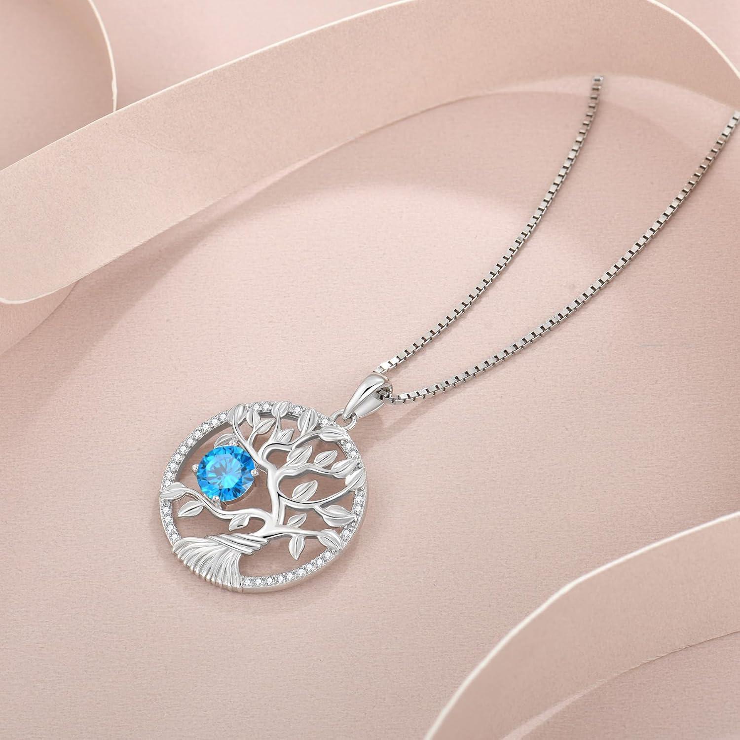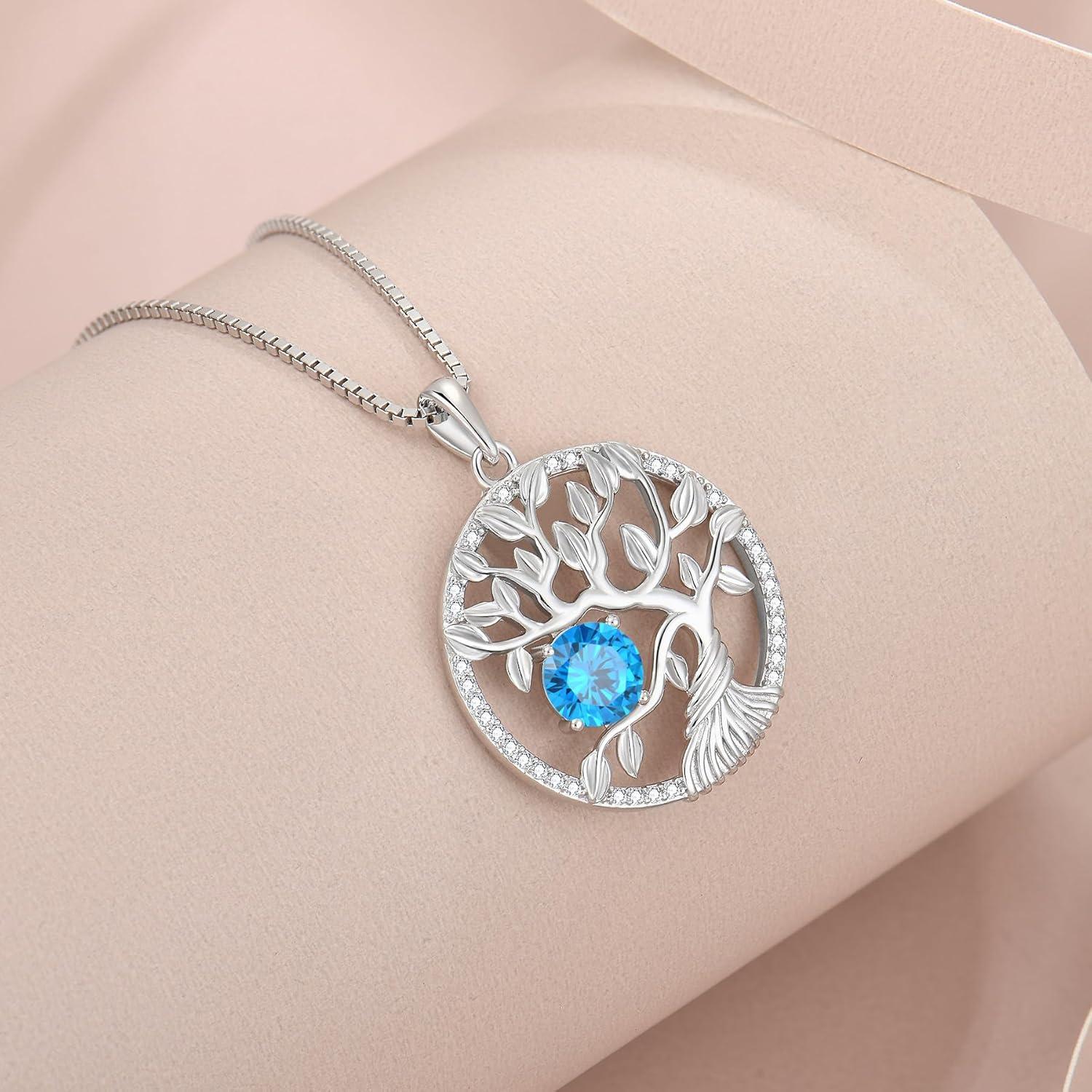Tree of Life Necklace 925 Sterling Silver Family Tree Pendant Birthstone Jewelry Gifts for Women(03 March – Aquamarine)