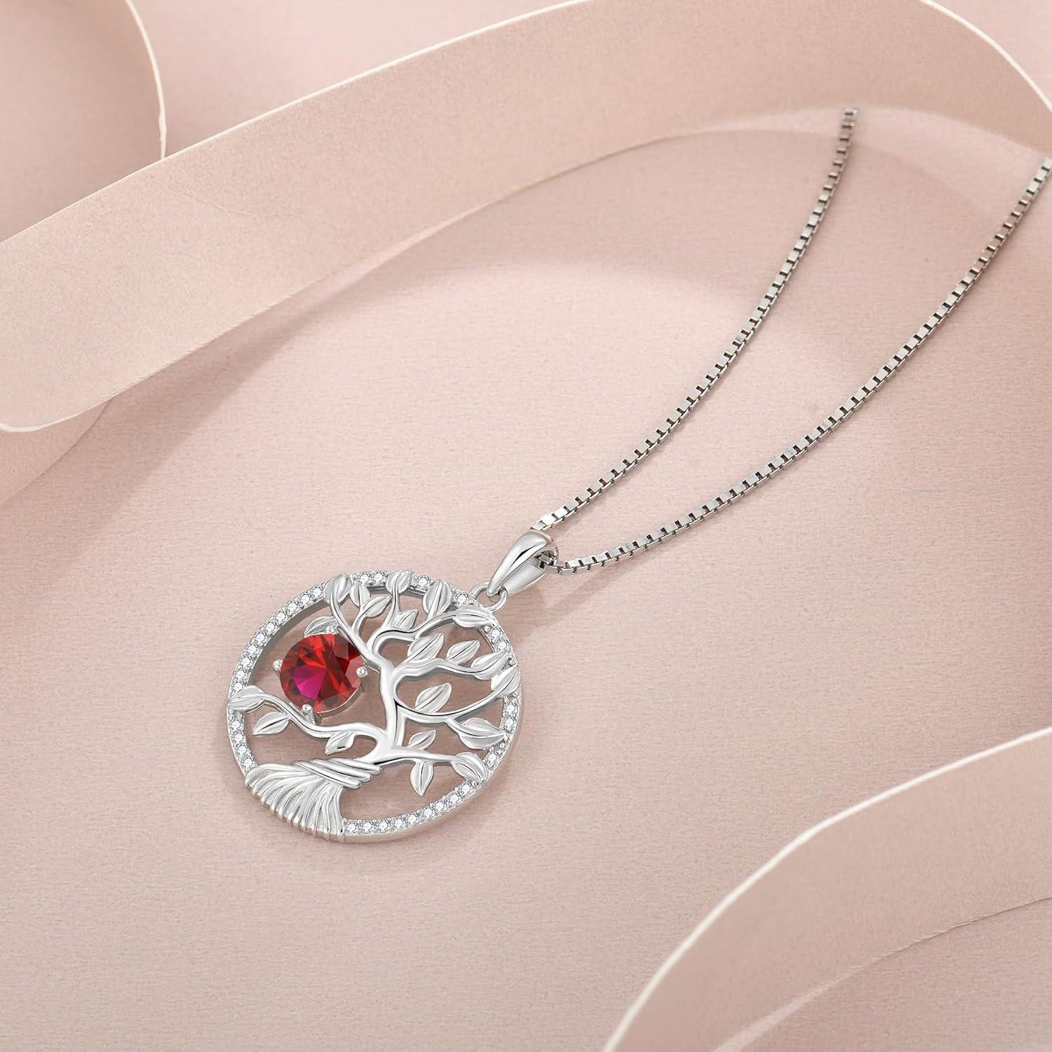 Tree of Life Necklace 925 Sterling Silver Family Tree Pendant Birthstone Jewelry Gifts for Women(07 July – Ruby)